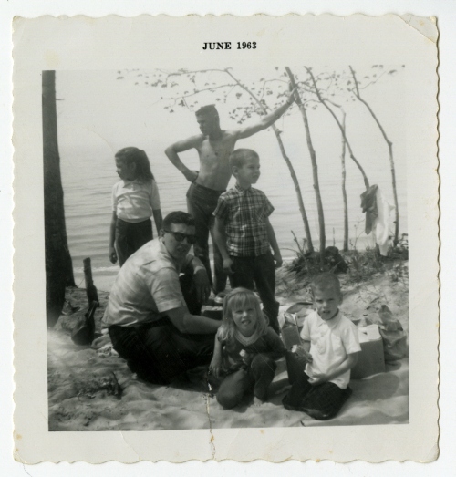 Mom captured a picnic stop along Lake Michigan en route to visiting relatives; I’m on the left behind Dad, looking back toward the Mackinac Bridge